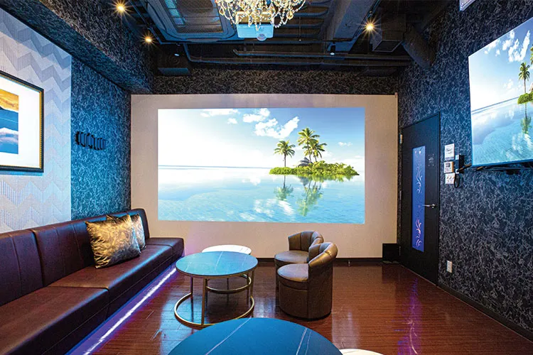 | 設備 | ・DVD&Blu-rayプレーヤー ・スマホ接続用コネクター ・スマホ充電器 ・照明カラーを推しカラーに変更OK!全10色対応可能!(赤・青・黄・紫・緑・ピンク・白・オレンジ・水色・黄緑) ・180インチスクリーン ・55インチモニター ・5.1サラウンドシステム ・LIVEDAM STADIUM(採点可能) ・Fire TV Stick |