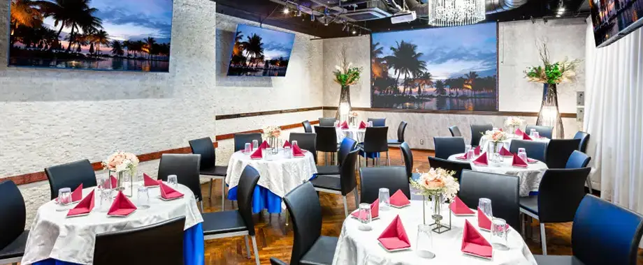 明るさ抜群の落ち着いたバリ風空間。平日は法人パーティー、週末は同窓会や結婚式二次会で人気の会場です。