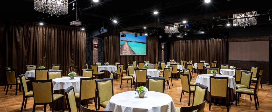 5画面の大型スクリーンと充実の音響設備。IT企業やスタートアップの宴会・歓送迎会に人気の会場です。