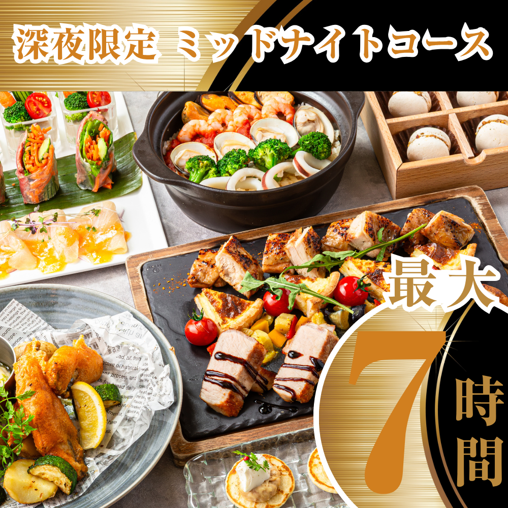 お得なだけでなく、料理も本格派。スタンダード飲み放題に加え、深夜でもしっかりお食事を楽しめる7品コースをご用意しています。
