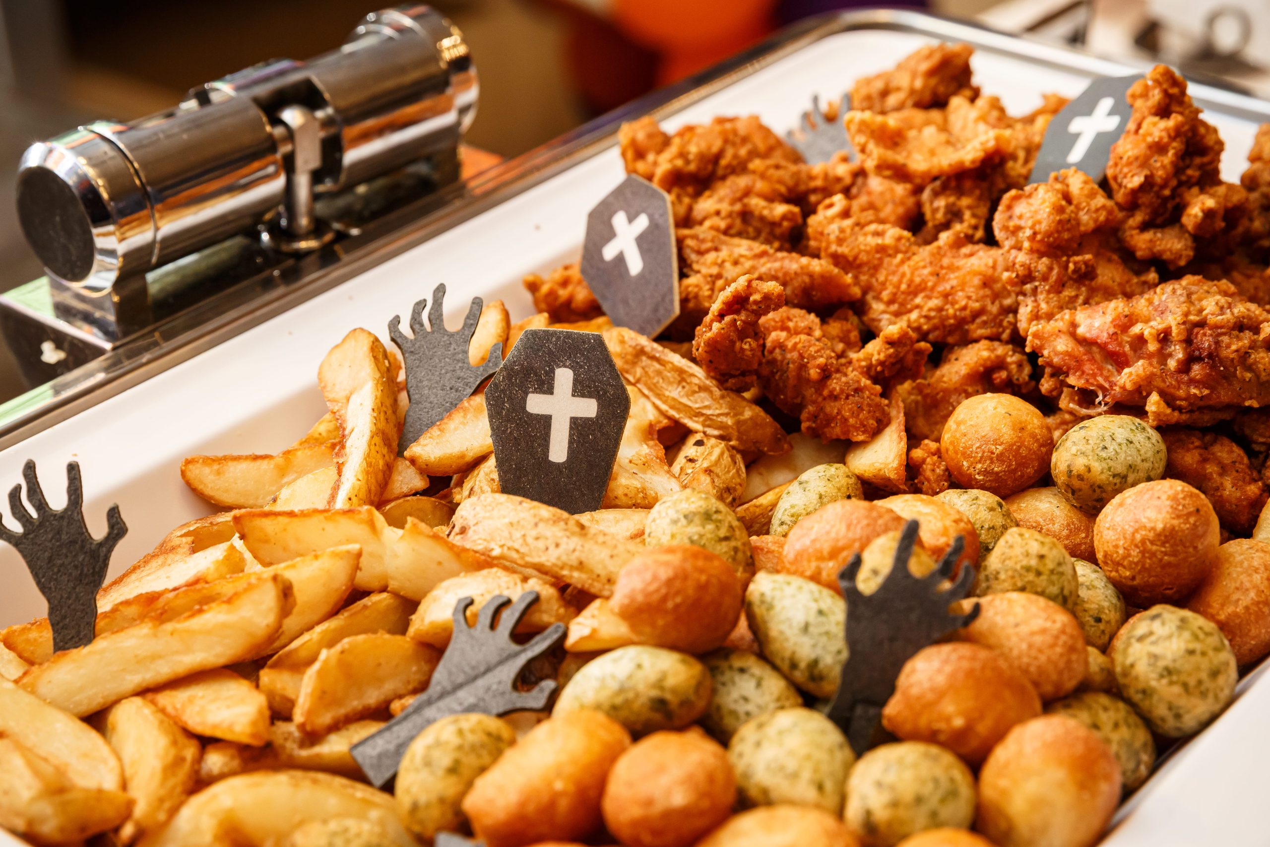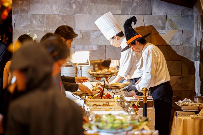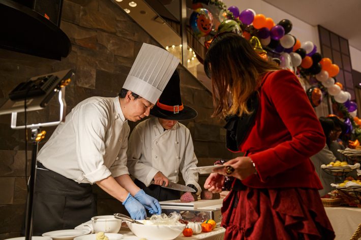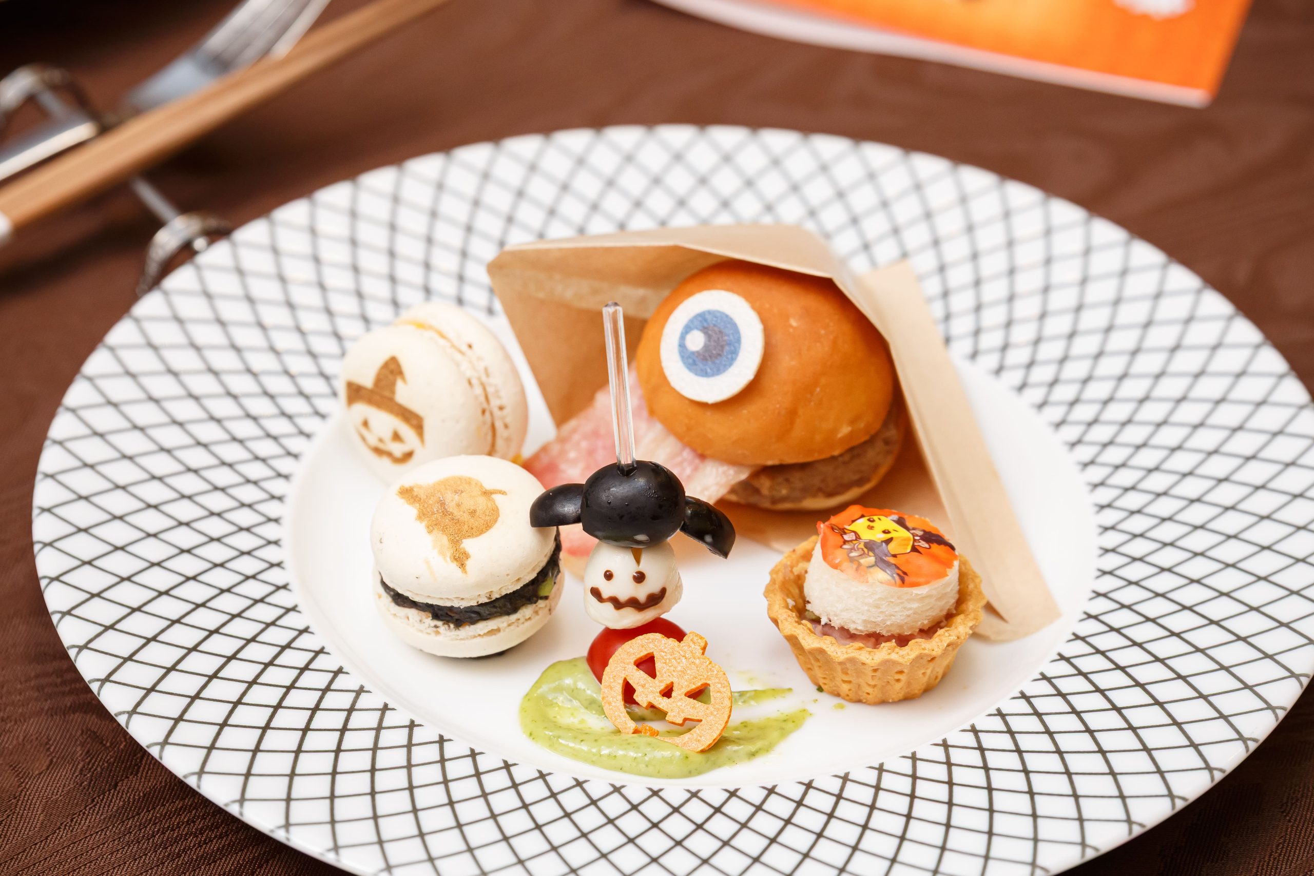 お料理とドリンクは、当イベントのためだけにシェフが考案した特別メニューをビュッフェ形式でご提供!可愛い見た目のハロウィンのグラタンやミニバーガー、さらに焼きたてで香り高いライブステーキも!