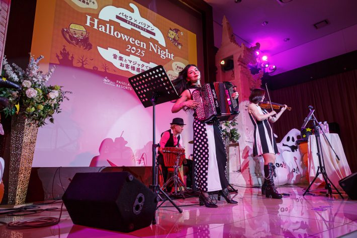 ステージイベントでは、ピアノやバイオリン、カホンの生演奏のほか、マジックショーも。ハロウィンの夜にふさわしいステージで大変盛り上がりました。